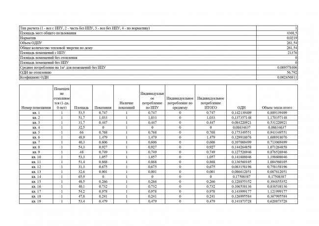 Порядок расчета услуги "отопление" установлен пунктами 42(1), 43 Правил предоставления коммунальных услуг собственникам и пользователям помещений в многоквартирных домах и жилых домов, утвержденных постановлением Правительства РФ от 6 мая 2011 г. № 354 «О предоставлении коммунальных услуг собственникам и пользователям помещений в многоквартирных домах и жилых домов» (далее – Правила), согласно утвержденным формулам расчета. Для Вашего дома, формула расчета коммунальной услуги «отопление» установлена пунктом 3(3) приложения №2 к Правилам № 354. Если МКД оборудован ОДПУ тепловой энергии, а все жилые и нежилые помещения дома – ИПУ, то плата за коммунальную услугу по отоплению рассчитывается следующим образом: Размер платы для одного жилого или нежилого помещения в МКД = Общая площадь Вашего помещения ÷ Общая площадь всех жилых и нежилых помещений в МКД × Объем тепловой энергии, предоставленный за расчетный период в МКД + Объем тепловой энергии на индивидуальное потребление за расчетный период, по показаниям ИПУ × Тариф на тепловую энергию Формула: Объем тепловой энергии, предоставленный за расчетный период в МКД = Объем тепловой энергии, потребленной за расчетный период в МКД, по показаниям ОДПУ – Суммарный объем тепловой энергии на индивидуальное потребление, по показаниям ИПУ Простым языком это означает, что если в многоквартирном доме есть ОДПУ (общедомовой прибор учета) и одновременно все жилые или нежилые помещения имеют ИПУ, то размер платы за коммунальную услугу по отоплению определяется: — по показаниям ИПУ; — к плате по показаниям ИПУ добавляется плата за коммунальную услугу на содержание общего имущества, рассчитываемая по ОДПУ за вычетом потребления объема (количества) тепловой энергии, потребленного во всех жилых или нежилых помещения (абз. 5 п. 42(1) Правил № 354).