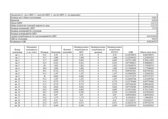 Порядок расчета услуги "отопление" установлен пунктами 42(1), 43 Правил предоставления коммунальных услуг собственникам и пользователям помещений в многоквартирных домах и жилых домов, утвержденных постановлением Правительства РФ от 6 мая 2011 г. № 354 «О предоставлении коммунальных услуг собственникам и пользователям помещений в многоквартирных домах и жилых домов» (далее – Правила), согласно утвержденным формулам расчета. Для Вашего дома, формула расчета коммунальной услуги «отопление» установлена пунктом 3(3) приложения №2 к Правилам № 354. Если МКД оборудован ОДПУ тепловой энергии, а все жилые и нежилые помещения дома – ИПУ, то плата за коммунальную услугу по отоплению рассчитывается следующим образом: Размер платы для одного жилого или нежилого помещения в МКД = Общая площадь Вашего помещения ÷ Общая площадь всех жилых и нежилых помещений в МКД × Объем тепловой энергии, предоставленный за расчетный период в МКД + Объем тепловой энергии на индивидуальное потребление за расчетный период, по показаниям ИПУ × Тариф на тепловую энергию Формула: Объем тепловой энергии, предоставленный за расчетный период в МКД = Объем тепловой энергии, потребленной за расчетный период в МКД, по показаниям ОДПУ – Суммарный объем тепловой энергии на индивидуальное потребление, по показаниям ИПУ Простым языком это означает, что если в многоквартирном доме есть ОДПУ (общедомовой прибор учета) и одновременно все жилые или нежилые помещения имеют ИПУ, то размер платы за коммунальную услугу по отоплению определяется: — по показаниям ИПУ; — к плате по показаниям ИПУ добавляется плата за коммунальную услугу на содержание общего имущества, рассчитываемая по ОДПУ за вычетом потребления объема (количества) тепловой энергии, потребленного во всех жилых или нежилых помещения (абз. 5 п. 42(1) Правил № 354).